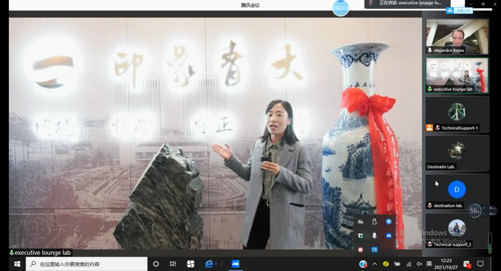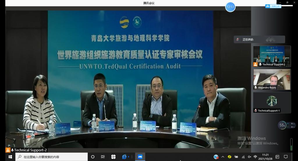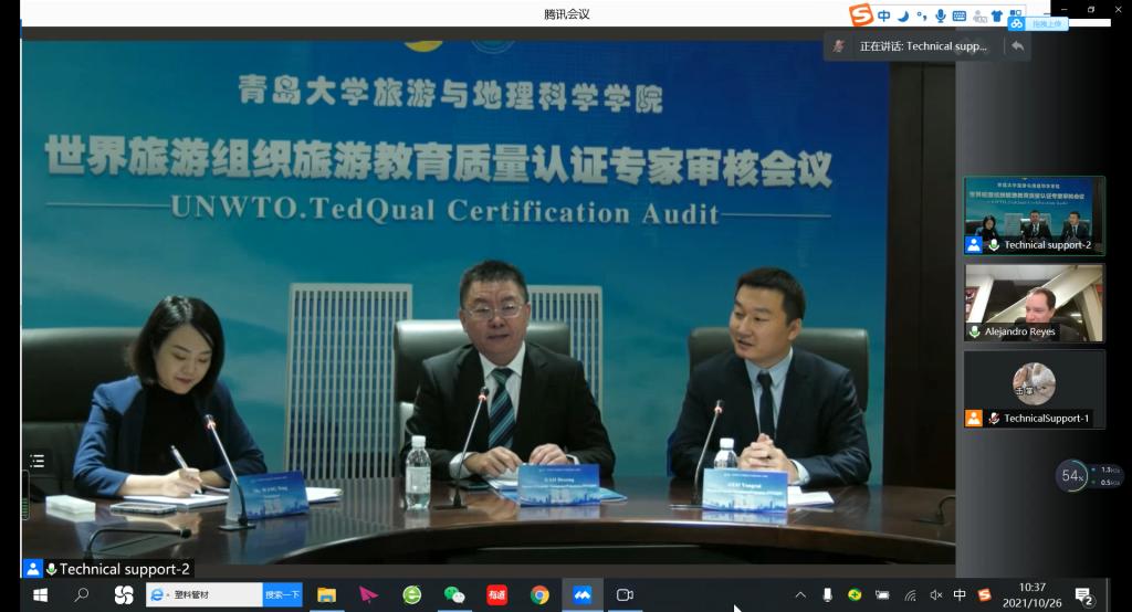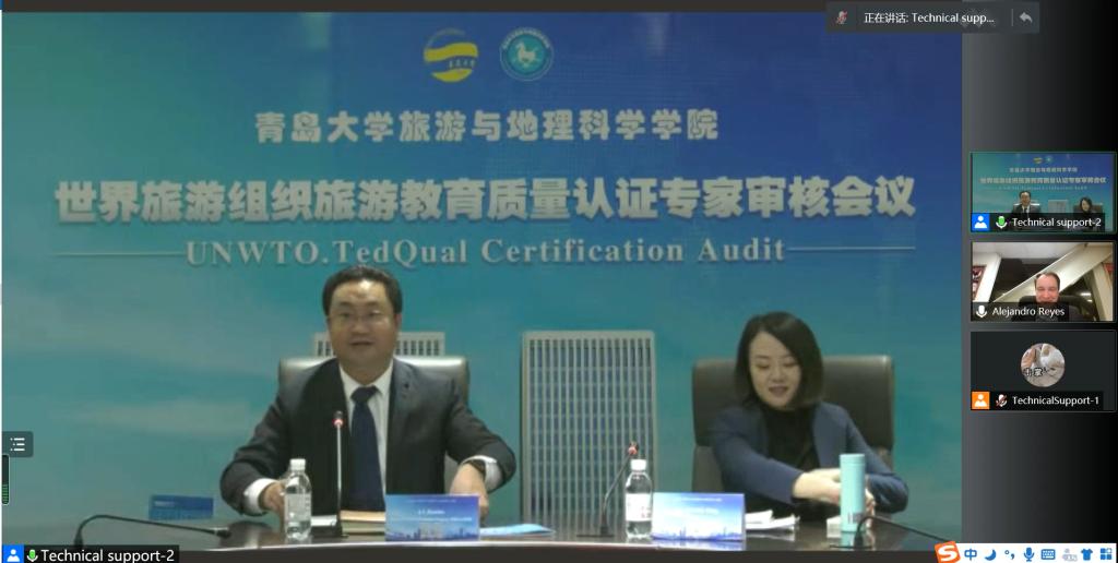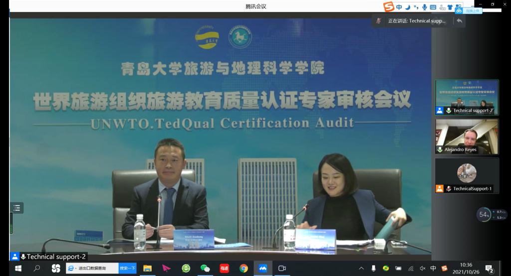 2021年11月5日上午,我院旅游管理专业和酒店管理专业联合国世界旅游组织教育质量认证审核工作反馈会在会议中心301召开。校党委常委、副校长孔伟金出席会议并致辞,学校教务处、财务处、学生处、人力资源处、国际交流合作处、资产与实验室管理处负责人、旅游与地理科学学院负责人、认证工作小组成员、教师代表等参加反馈会。联合国世界旅游组织旅游教育质量认证专家Dr.Reyes在墨西哥通过视频线上参加反馈会。