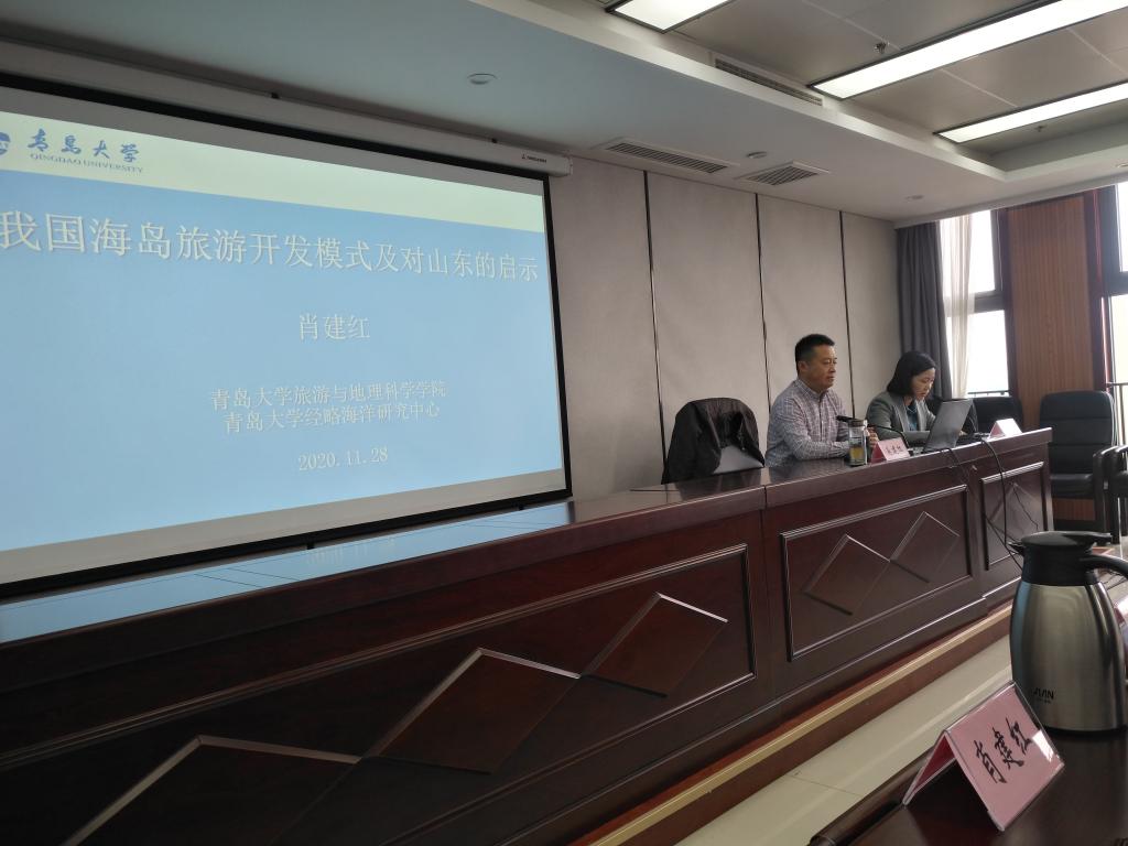 肖建红教授以“我国海岛旅游开发模式及对山东的启示”为题,全面阐释了我国海岛旅游的基本情况、海岛旅游开发模式和典型案例,并对山东海洋文旅公司如何精准定位市场、如何打造太阳文化提出了建议。赵玉宗副教授以“文旅融合:内涵、路径与典型案例”为题,系统梳理了文旅融合的内涵、文旅融合具体路径,并细致讲解文旅融合的经典案例,为山东海洋文旅公司的文融融合提供了新思路。