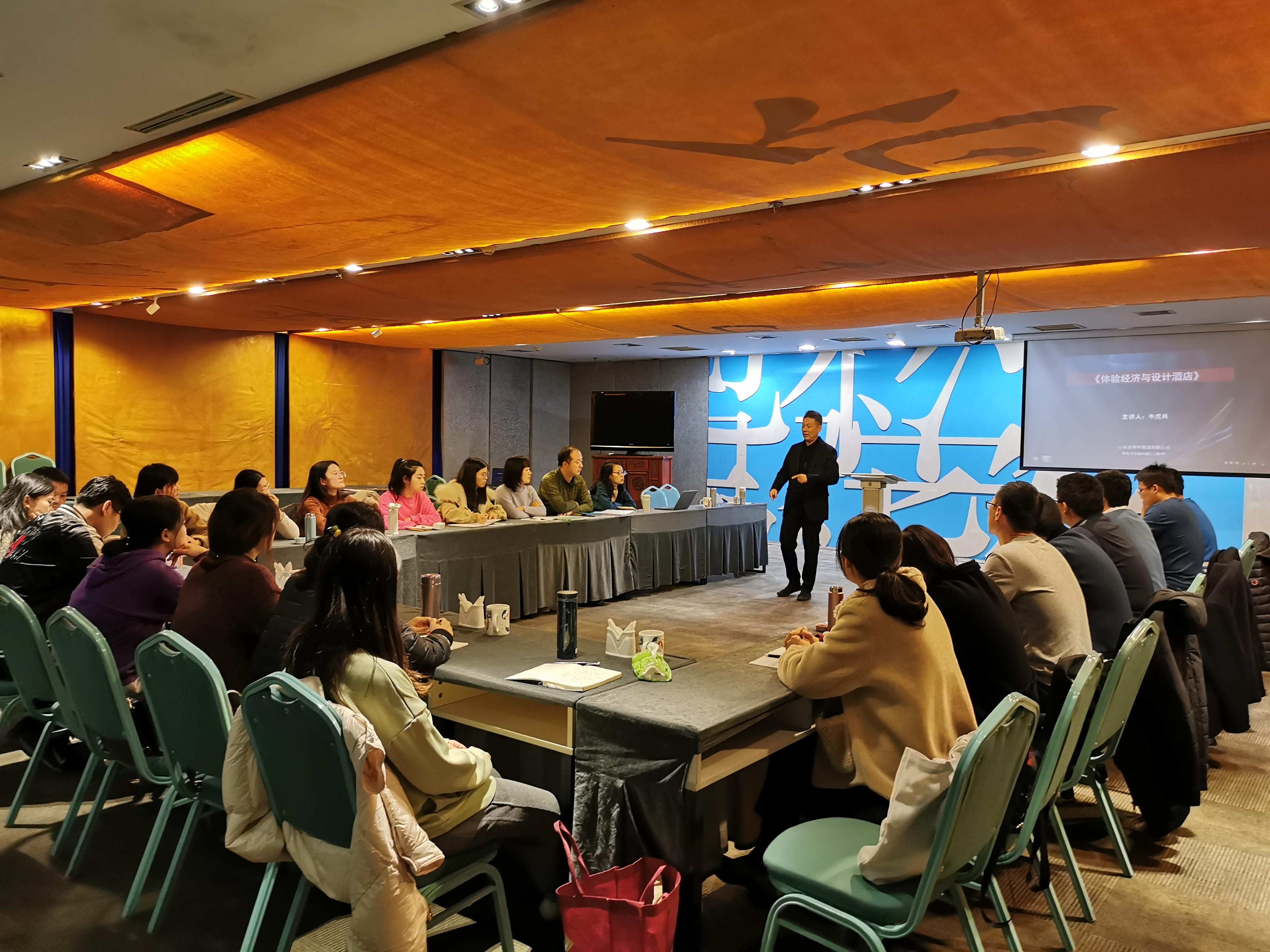 11月24日上午,我院旅游管理专业硕士(MTA)研究生在学院副院长张言庆老师带领下赴青岛大学-齐鲁文化创意产业园研究生联合培养基地开展了移动课堂教学活动。此次移动课堂教学包括基地参观和专家讲座两部分内容。首先,同学们在齐鲁文化创意产业园朱宏瑞经理引导下,参观了园区内的CHINA公社设计酒店体验区、山东菜馆齐鲁食文化体验区、设计师品牌集成店、太经堂经络养生区、龙象天和太极拳会馆、如意轩茶事禅意冥想空间、国学讲堂、和合书社等功能区,对近年来产业园在文旅融合、康养结合、文化创意等方面开展的工作和取得的成果有了较为全面的了解;之后,我院旅游管理专业研究生校外导师,山东老转村集团、齐鲁文化创意产业园董事长牛虎兵先生为同学们做了题为“体验经济与设计酒店”的专题讲座。在近三个小时的讲座中,牛董事长结合他在体验经济和设计酒店方面的理论研究和创业实践,从体验经济的缘起与产生基础、体验经济的定义与内涵、设计酒店的产生背景、设计酒店的内涵与特征、设计酒店与中国文化等方面向同学们介绍了体验经济的理论要点和典型案例。牛董事长还鼓励同学们把体验经济的理念积极应用于各自工作和学习中,积极开展体验经济和文化创意方面的理论研究与创业实践。