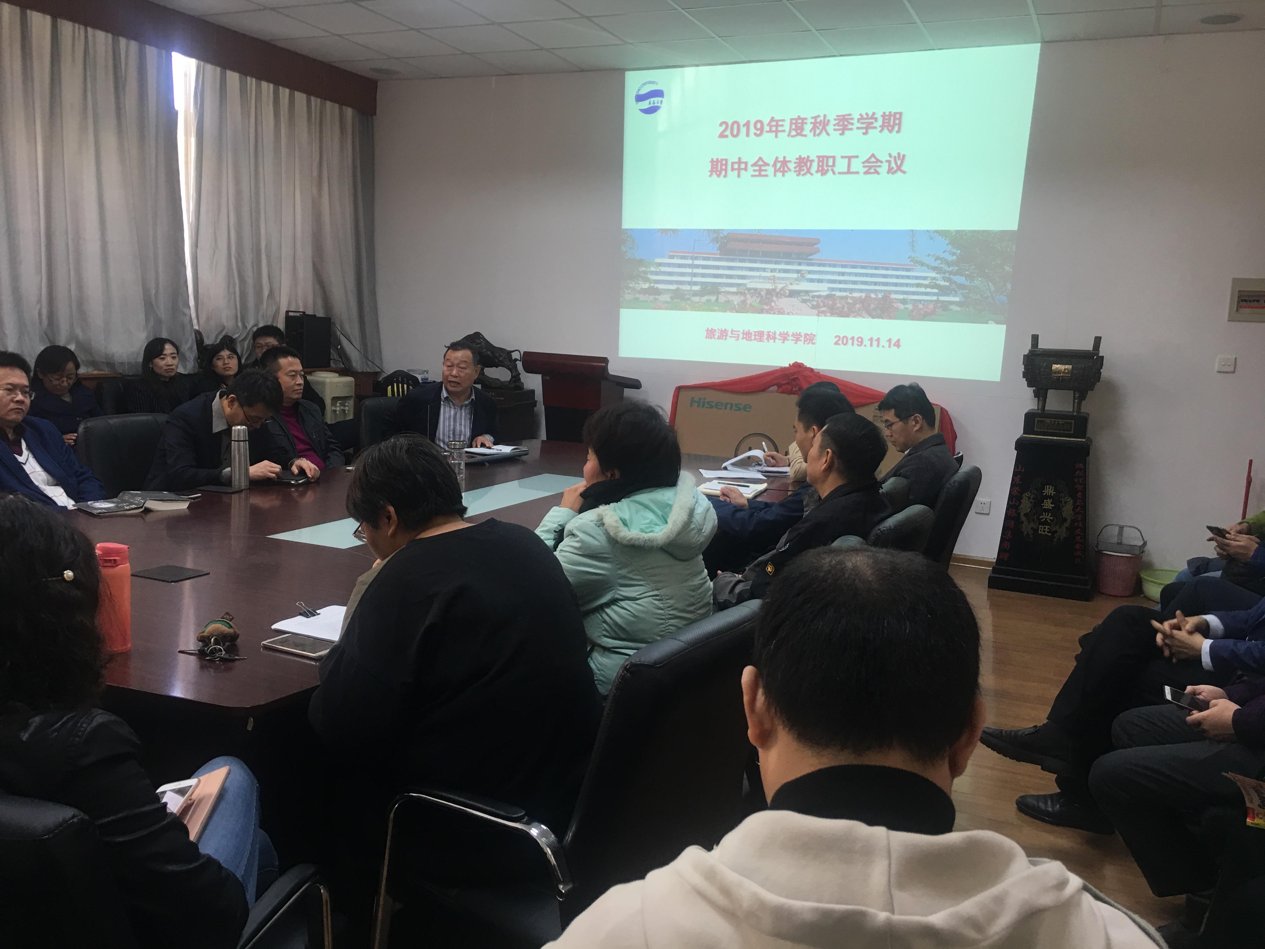 11月14日下午,旅游与地理科学学院在会议室召开全院教职工大会,对学院工作、期中教学检查、提高学生升学和就业率、学院绩效奖励分配办法等学院各项工进行研讨,以促进学院事业全面发展。