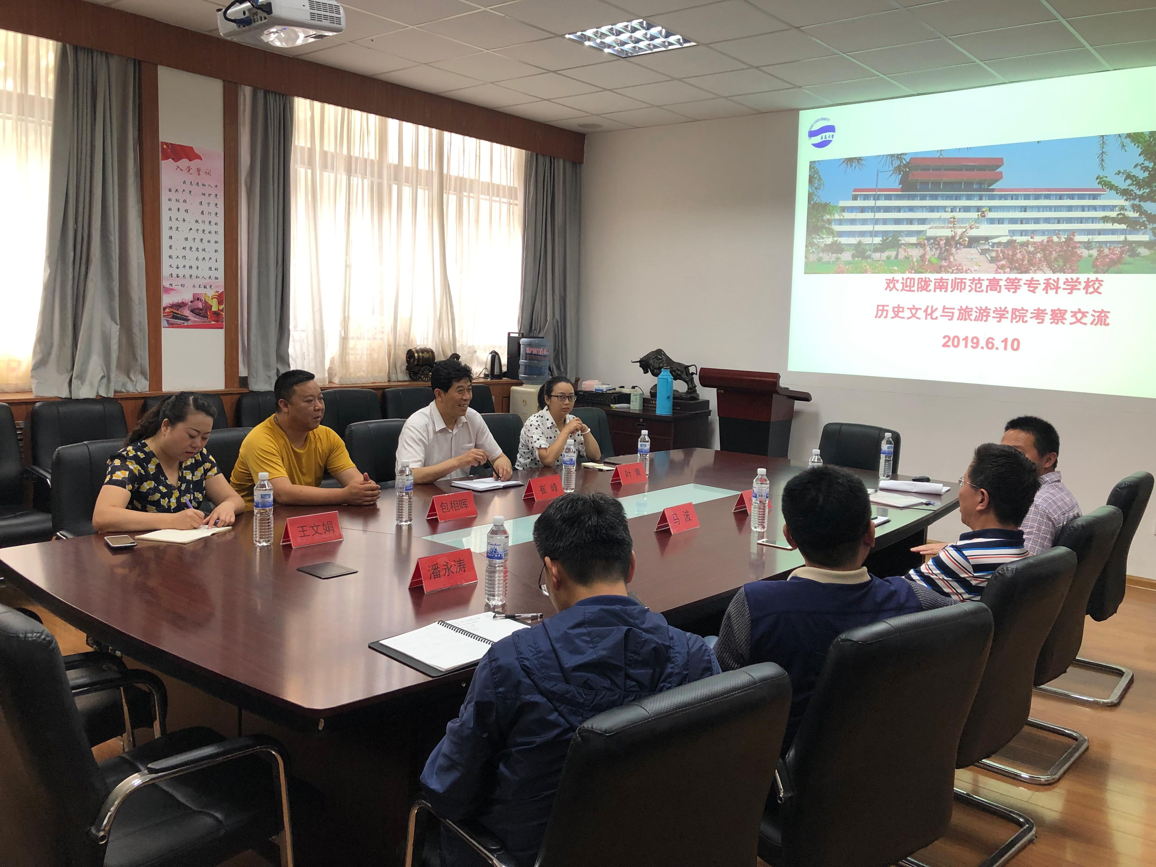 2019年6月10日下午,陇南师范高等专科学校历史文化与旅游学院崔峰院长等一行四人前来我院进行交流访问。我院肖建红院长、马波教授、酒店管理系高德宗主任、旅游与会展管理系潘永涛老师参加交流座谈会。
