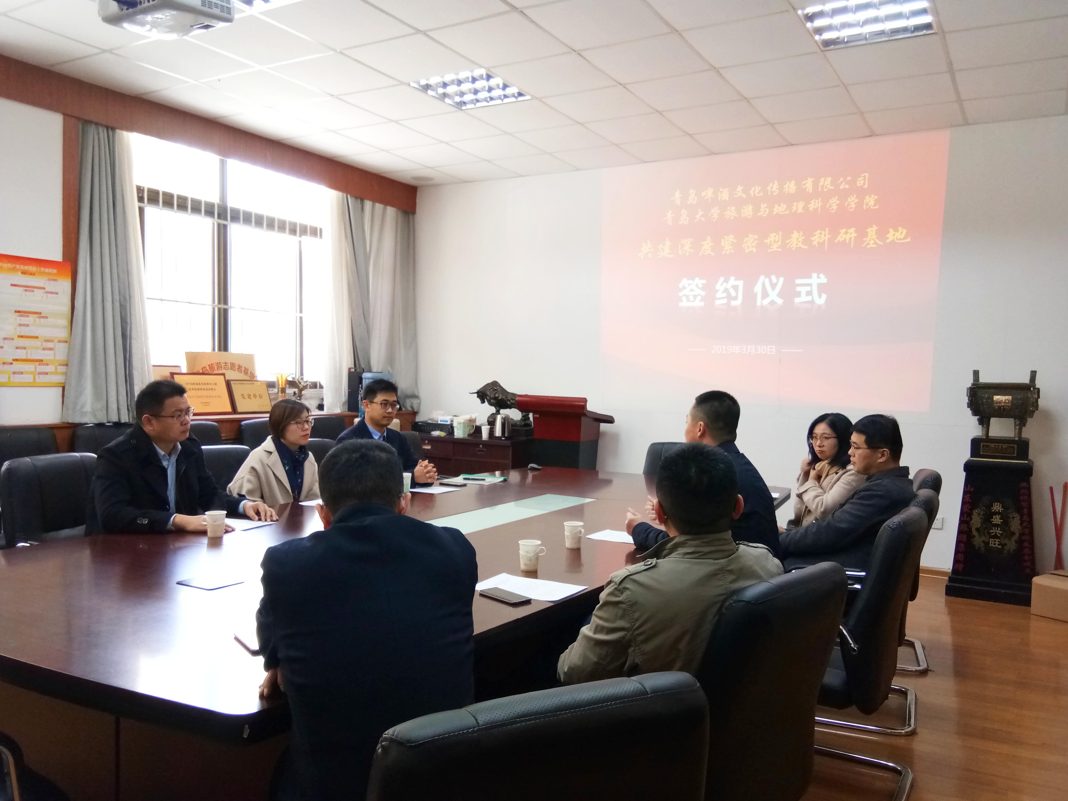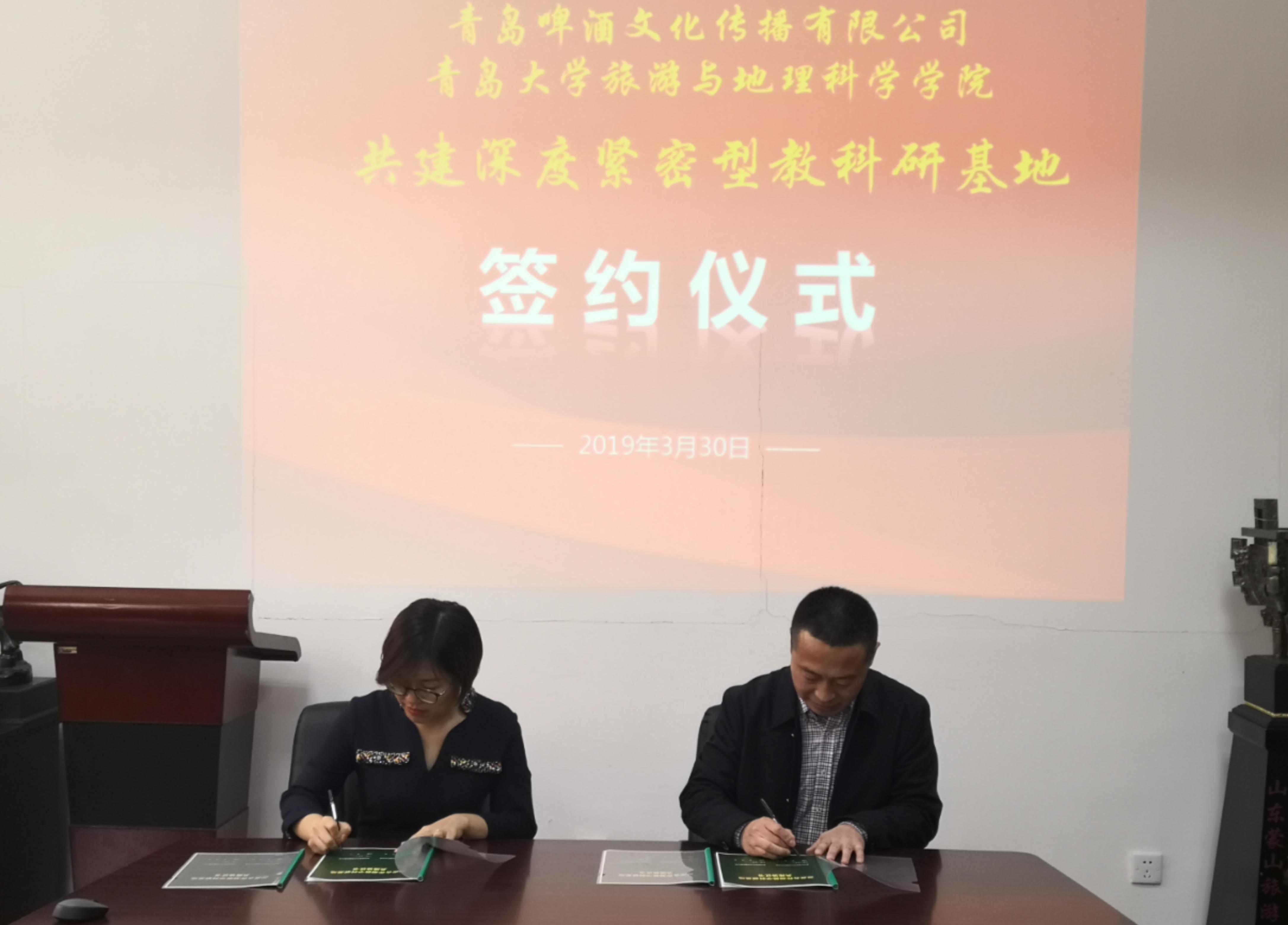 3月30日下午,旅游与地理科学学院与青岛啤酒文化传播有限公司共建深度紧密型教科研基地签约仪式在浮山校区东院睿思楼122室举行。青岛啤酒文化传播有限公司管理者代表、总经理助理、人力资源部部长曾超、青岛啤酒博物馆接待处经理姜绪军、人力资源部副部长王文苑,我院院长肖建红、副院长耿庆汇、院长助理赵玉宗、酒店管理系主任高德宗、旅游与会展管理系徐翠蓉老师等出席本次签约仪式。