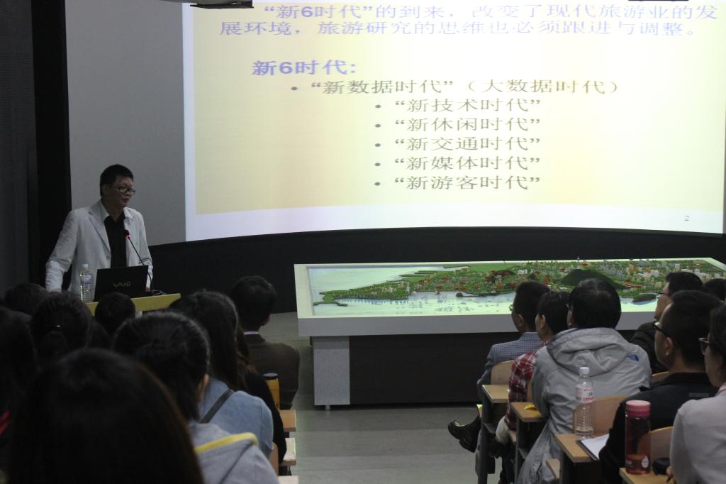 2015年4月29日19点旅游学院数字旅游实验室,著名学者、华侨大学博士生导师郑向敏教授应邀来我院做了“新6时代旅游研究思维”的学术报告会,学院教师、研究生、本科创新班学生70余人参加了报告会。