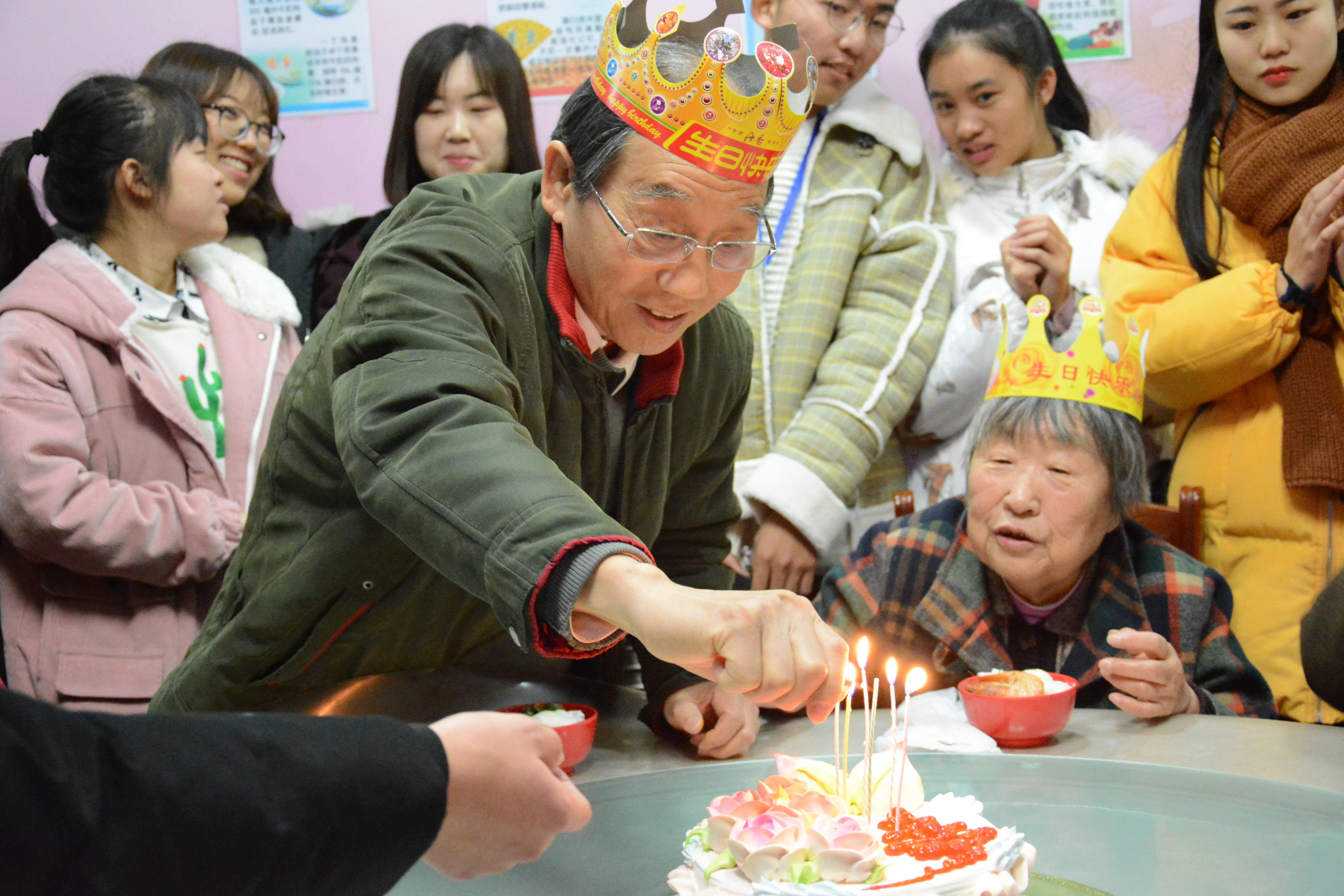 十一点,同学们到养老院餐厅给八位老人送生日蛋糕、唱生日歌并送上祝福。随后,同学们在工作人员带领下到餐厅帮助擦拭养老院桌子、凳子、柱子并拖地。