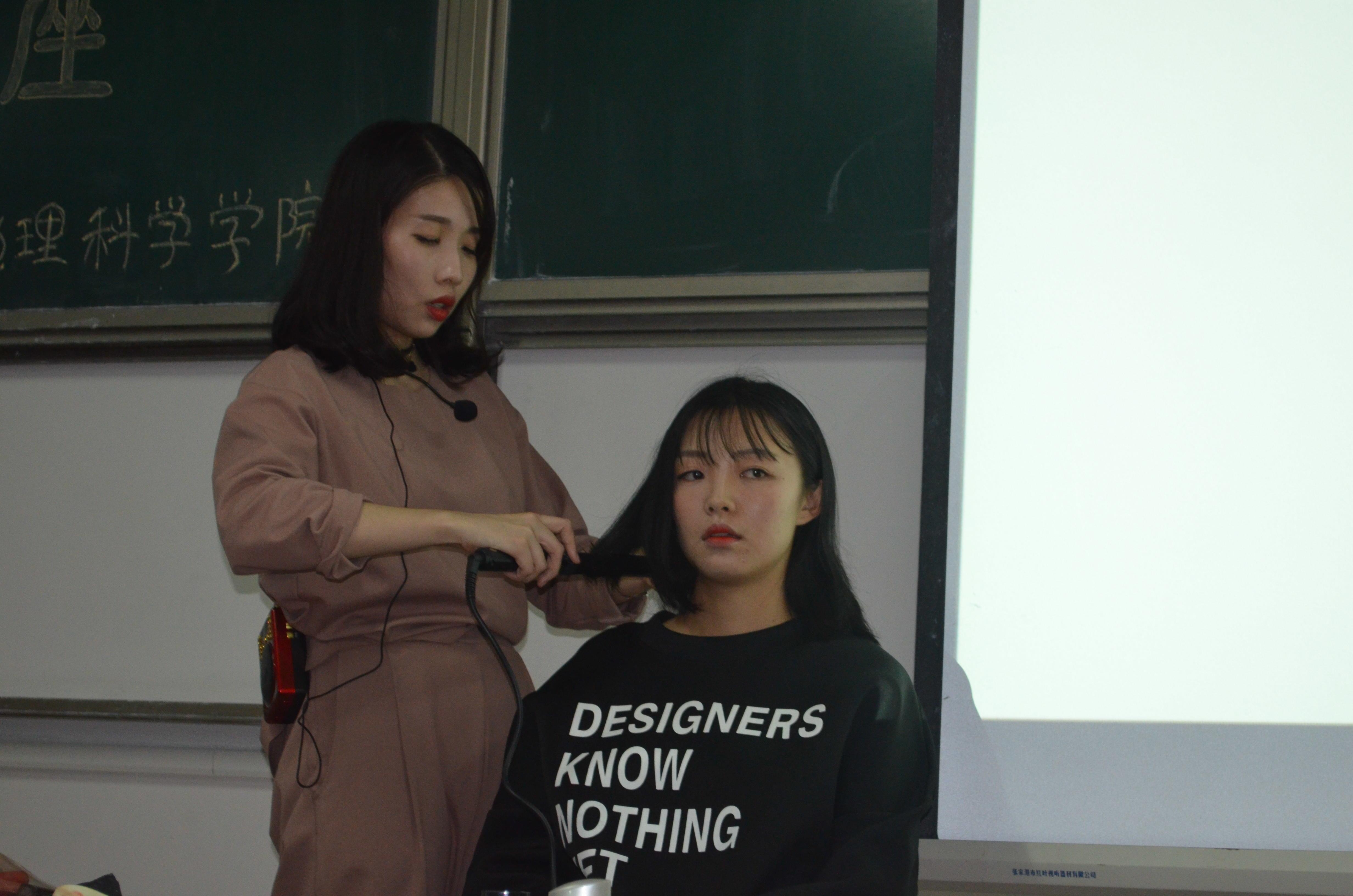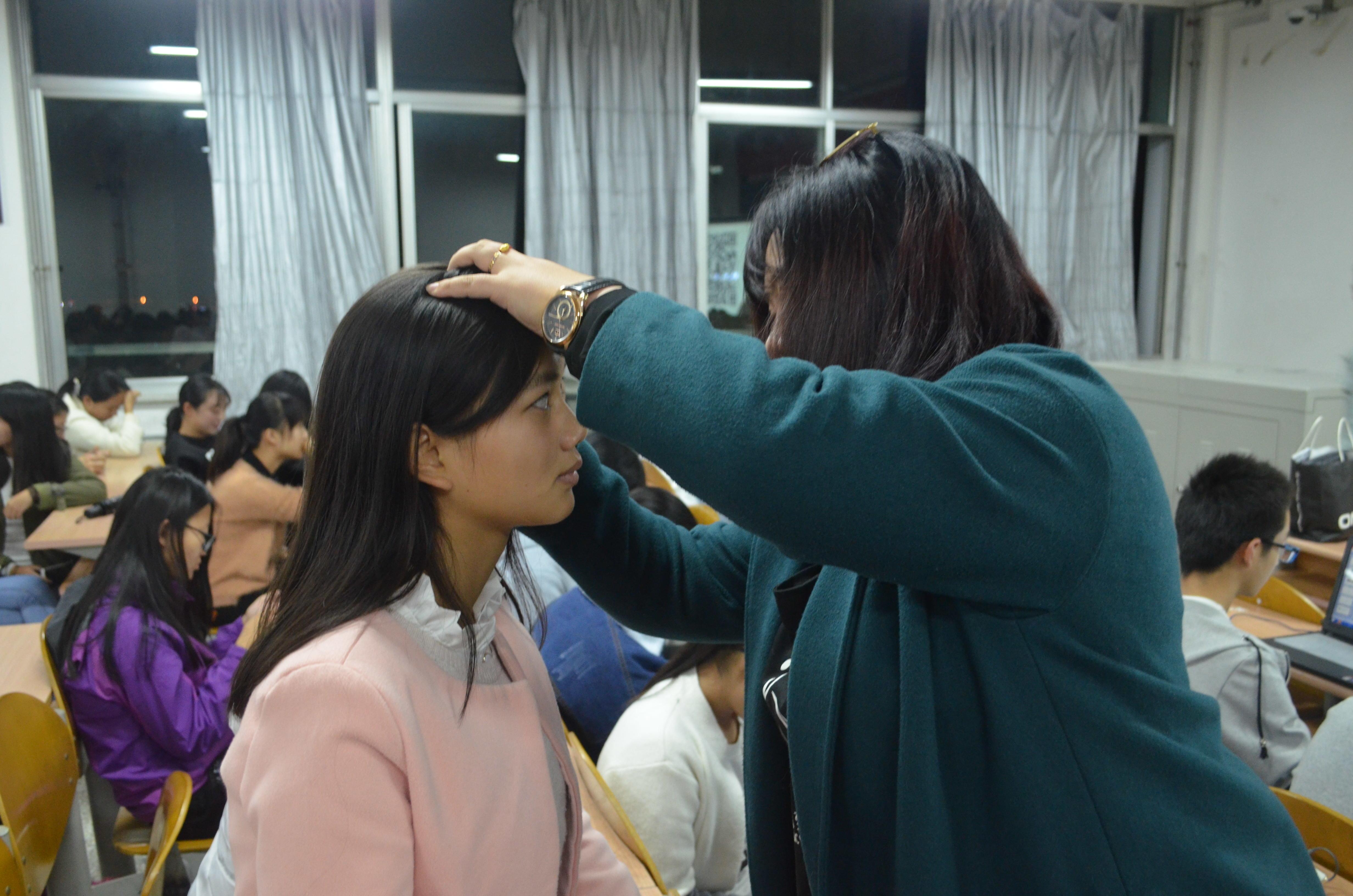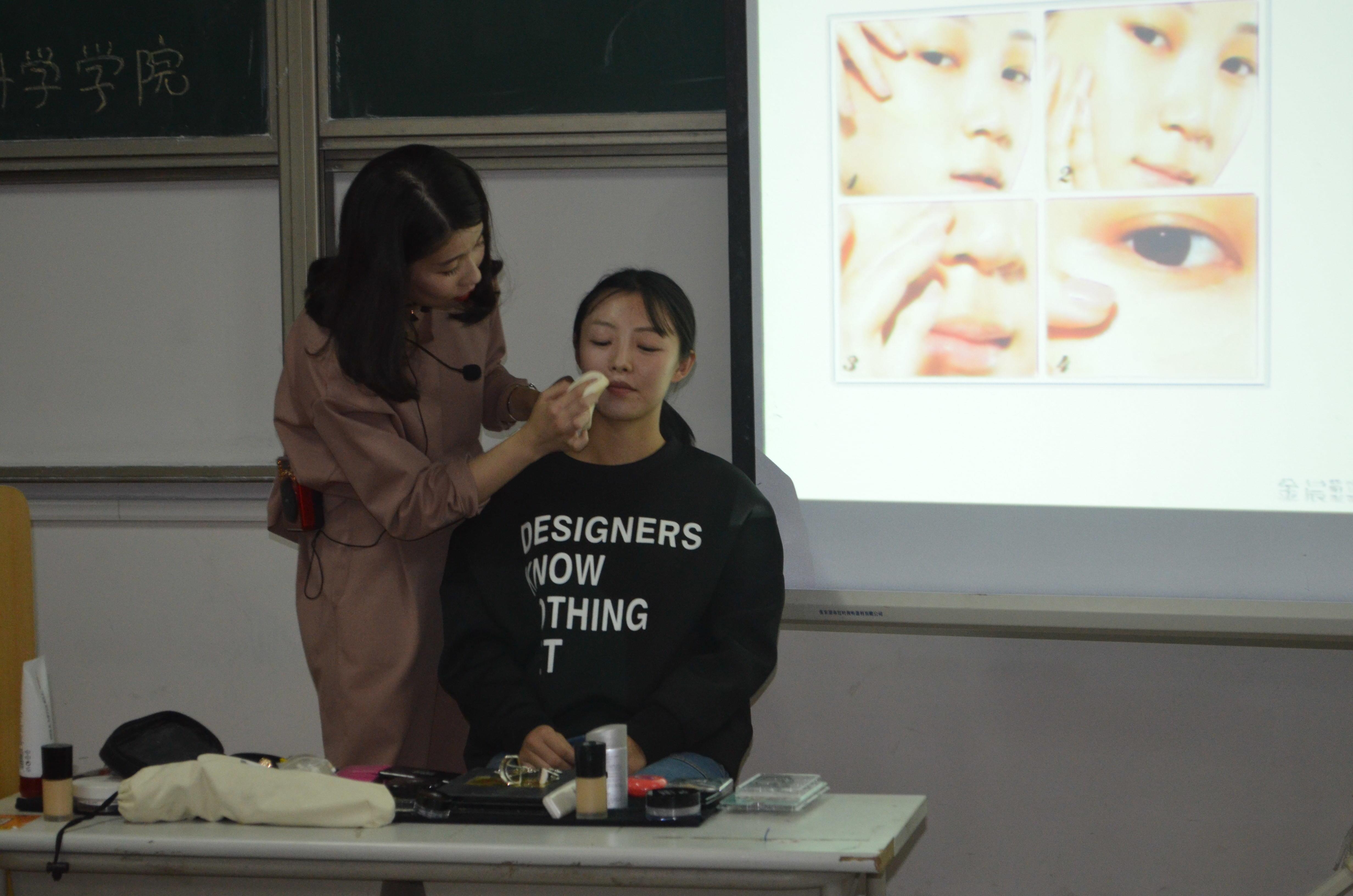 10月26日晚,由旅游与地理科学学院团委主办的化妆讲座于东校区西院一教408教室举行。出席讲座的嘉宾有金晨精致新娘的化妆师金晨老师及其时尚跟妆团队。本次讲座以“美丽‘妆’点人生”为主题,旨在向大学生普及基本的化妆知识,并进行化妆知识讲解和半面妆演示。