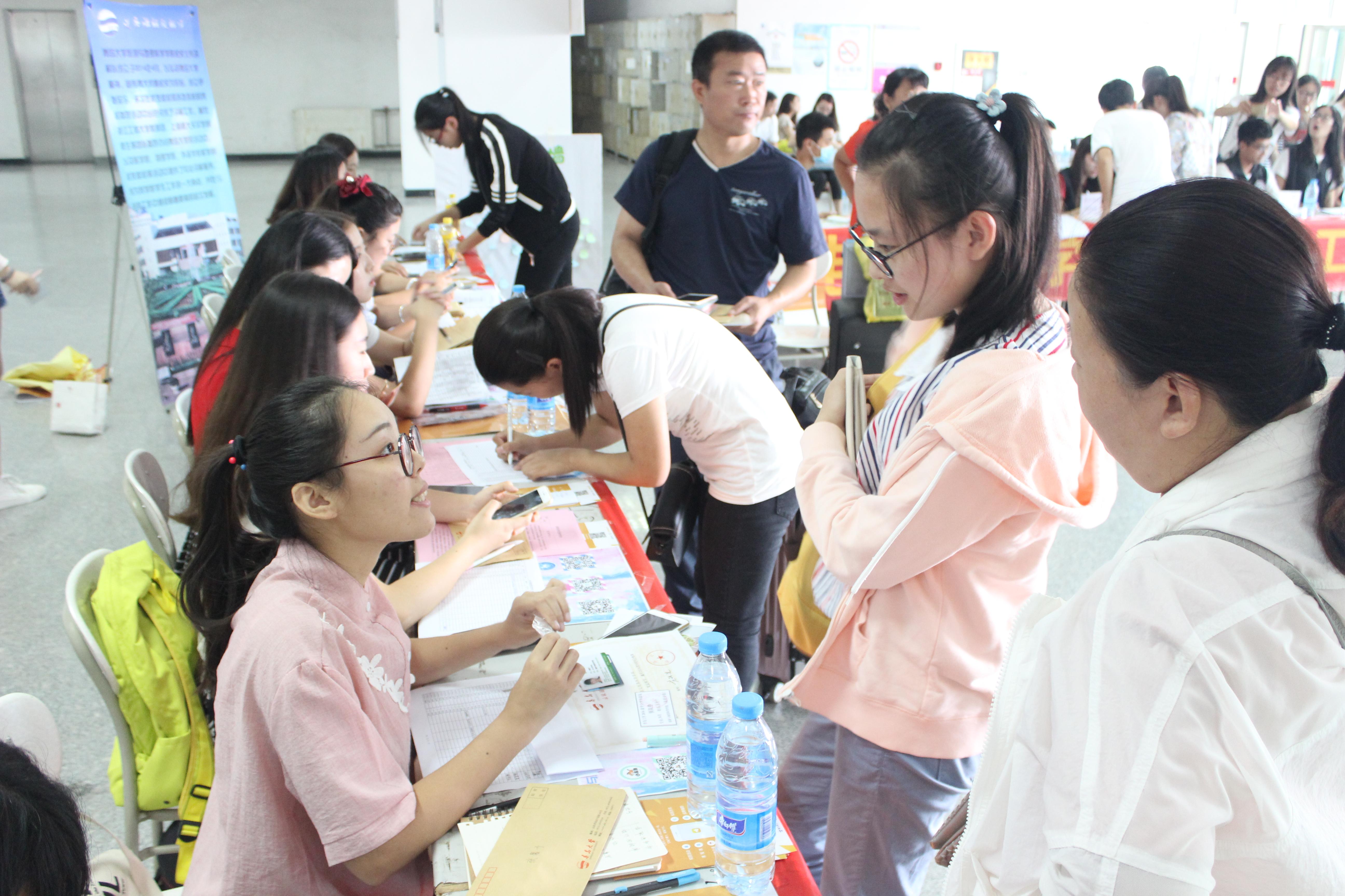 在迎新现场,新生报到确认、个人档案提交、住宿通知单及军训服装领取都有条不紊地进行着。旅游与地理科学学院辅导员老师、高年级的学长热情迎接新同学的到来,主动向新生和家长介绍学院相关情况并帮助他们解决各种问题,为广大新生的报到带来了极大的便利。