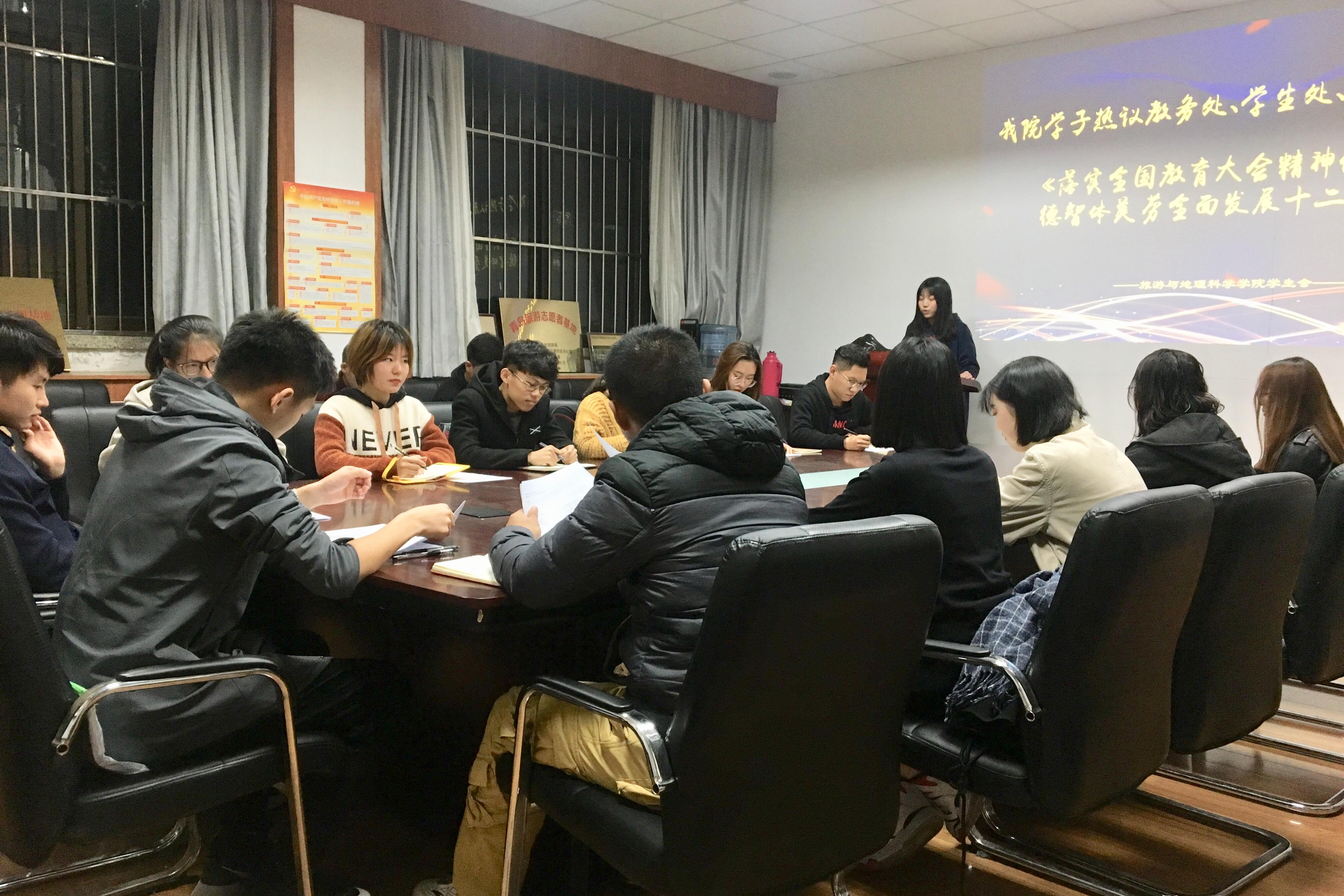 首先,2016级潘佳岩同学宣读了《落实全国大会精神促进学生德智体美劳全面发展十二条措施》,从开展主题教育活动、强化学风班风建设等12个方面介绍了落实推进具体工作的措施,全体与会人员对此展开热烈的讨论。随后,各年级学生代表分别就树立正确的价值观,全面发展。加强个人修养与自我成长,提高创造力,脚踏实地等方面分享了对《落实全国大会精神促进学生德智体美劳全面发展十二条措施》的感悟。紧接着,学生会各部门回顾过去关于促进德智体美劳全面发展中活动的开展情况。最后,学生会主席2016级王昱凯同学宣读了《旅游与地理科学学院学生会关于促进德智体美劳全面发展的七条措施》,旨在通过主题教育活动,强化学习,增强学生创新呢能力,促进全面活动的开展,切实促进学生的全面发展。