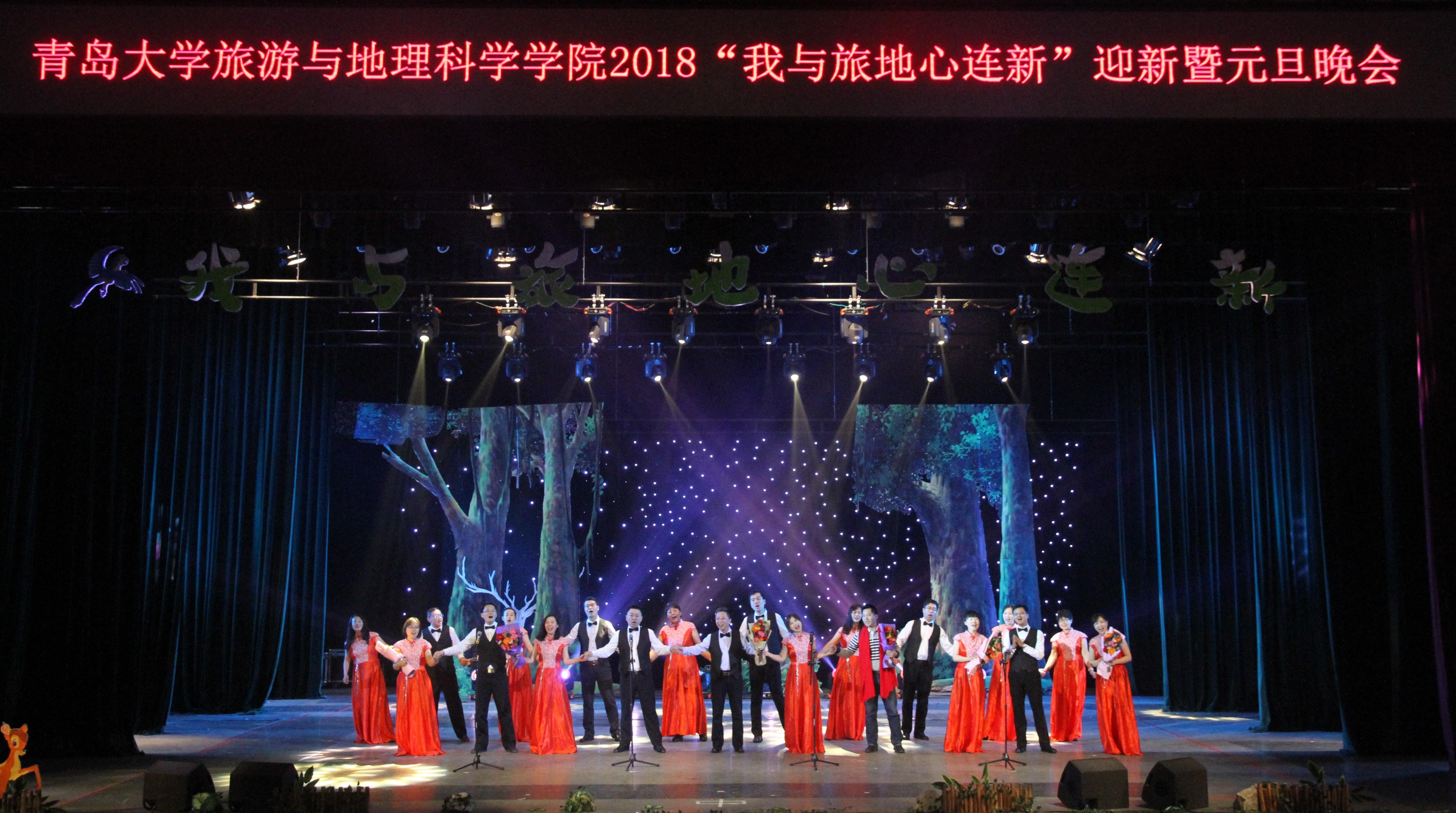 动感的开场舞拉开晚会序幕,男团女团用曼妙的舞姿引燃了全场的气氛。在接下来的视频回顾中,各位老师在镜头前表达了对新老生的期待与祝福。随后,旅游与地理科学学院院长马波、教师代表刘鸣以及学生代表赵玉英以“群口相声”的方式就2017年的收获及2018年的期待致辞。随之晚会正式开始,本场晚会共分“新遇见·心动”、“新启航·同行”、“新梦想·共筑”三个部分。晚会节目风格多样,各具特色,动听的民谣《安和桥》、诙谐的相声《新说学逗唱》、温馨的话剧《大学生活的千姿百态》、悠扬的笛子独奏《四时令》……给在场的师生献上一场视听盛宴。灯光随机抽奖环节和微信墙互动让同学们热情高涨。最后,由学院部分老师合唱的《相亲相爱一家人》让火爆的气氛归于平静温暖,晚会在温馨的氛围中圆满落幕。
