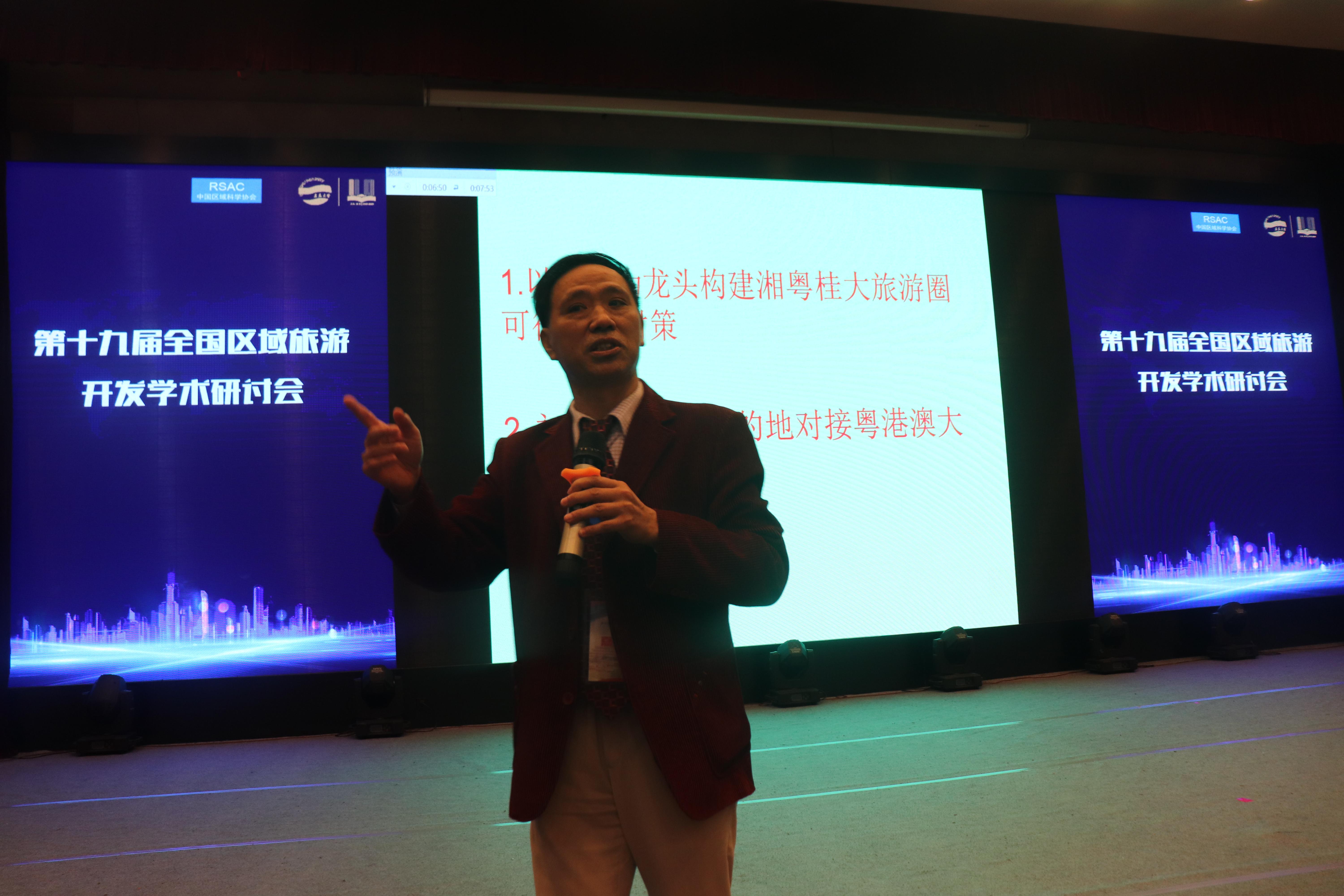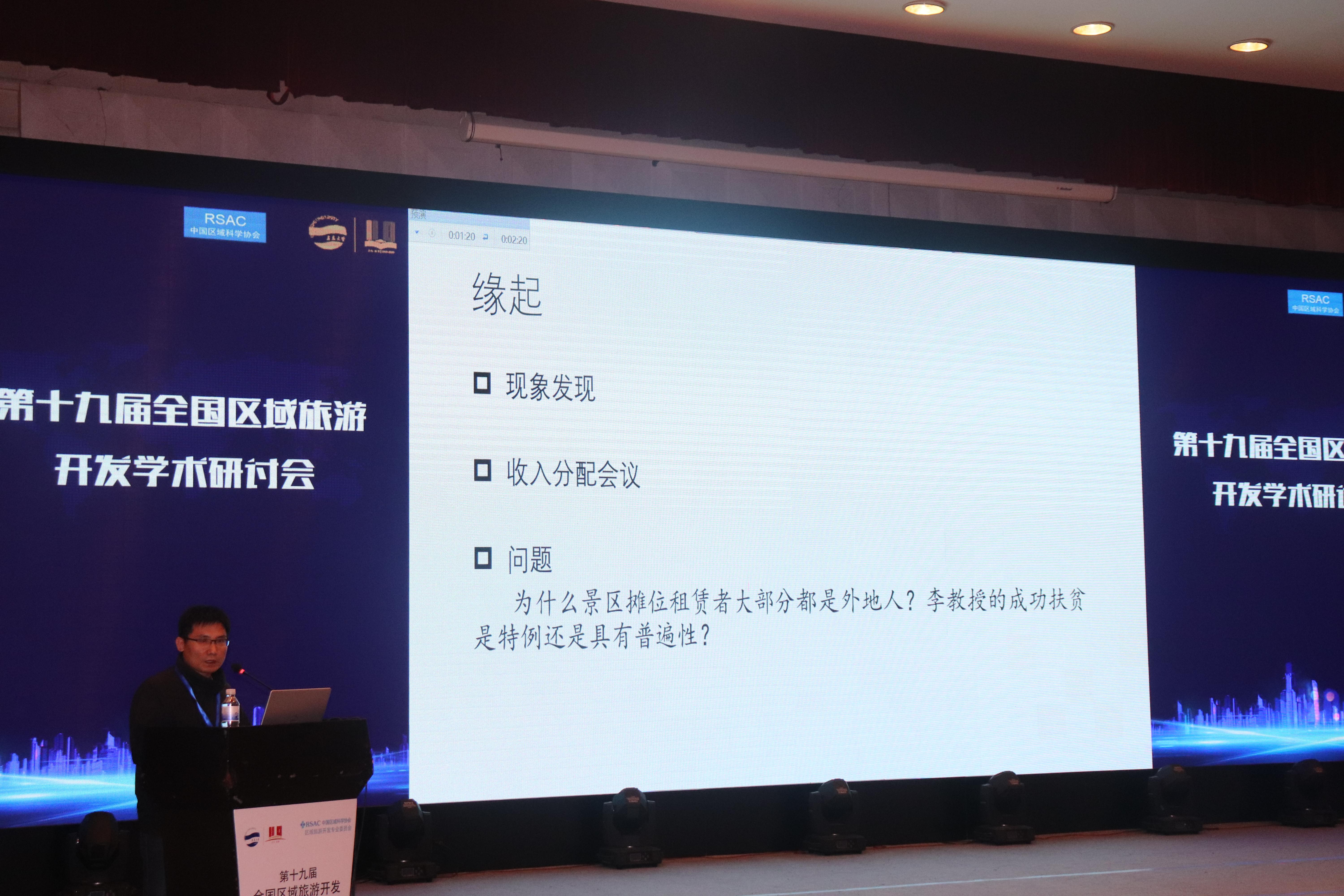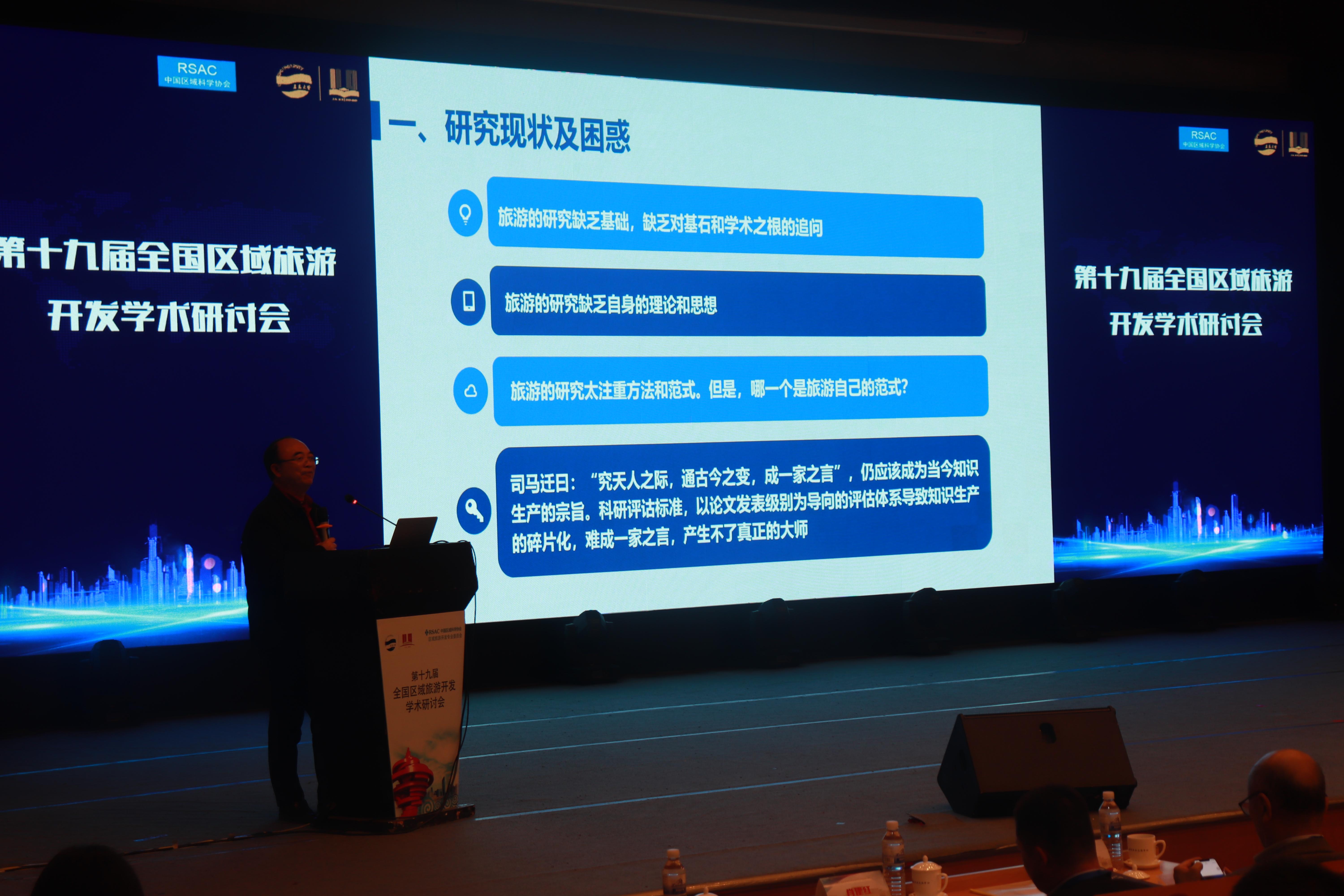 在大会主旨报告环节,来自北京大学吴必虎教授、四川大学杨振之教授、中国旅游研究院李仲广研究员、华南师范大学刘俊教授分别就旅游规划研究、旅游基础理论研究、科技与文旅高质量发展、我国旅游高等教育创新等话题做了精彩演讲。在区域旅游大讲堂板块,八位来自国内知名旅游学术机构的专家学者就农旅融合的乡村实践、乡村旅游推动乡村振兴、邮轮旅游高质量发展、乡村旅游扶贫等我国新时代旅游学术和行业领域的焦点和热点问题做了精彩报告。分组论坛环节,共有两组共12位青年学者分别从乡村振兴与旅游发展、大数据与智慧景区建设等方面展开了精彩的汇报与交流研讨,产生了很多有深度、有意义的观点,碰撞出了诸多有新意的学术火花。
