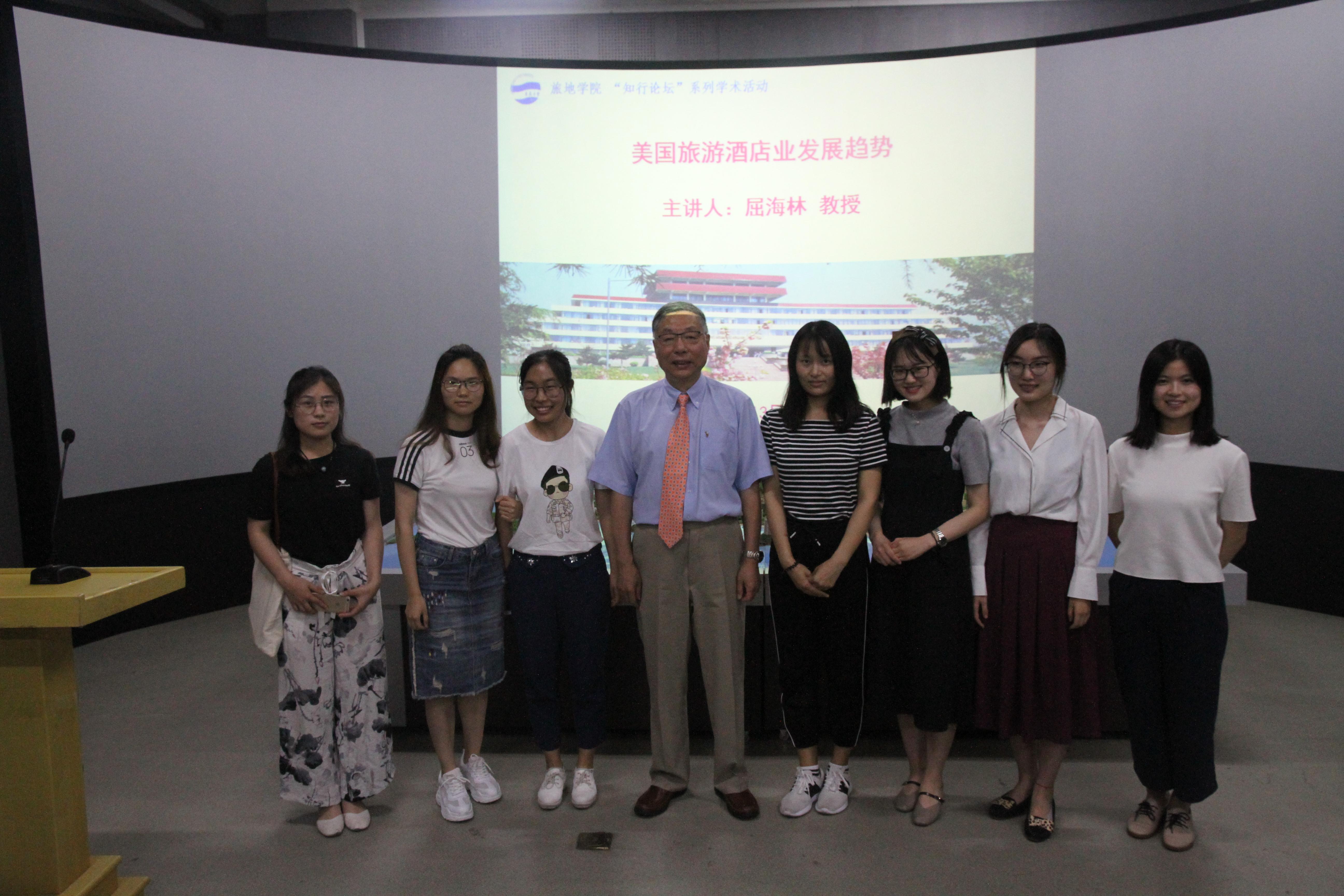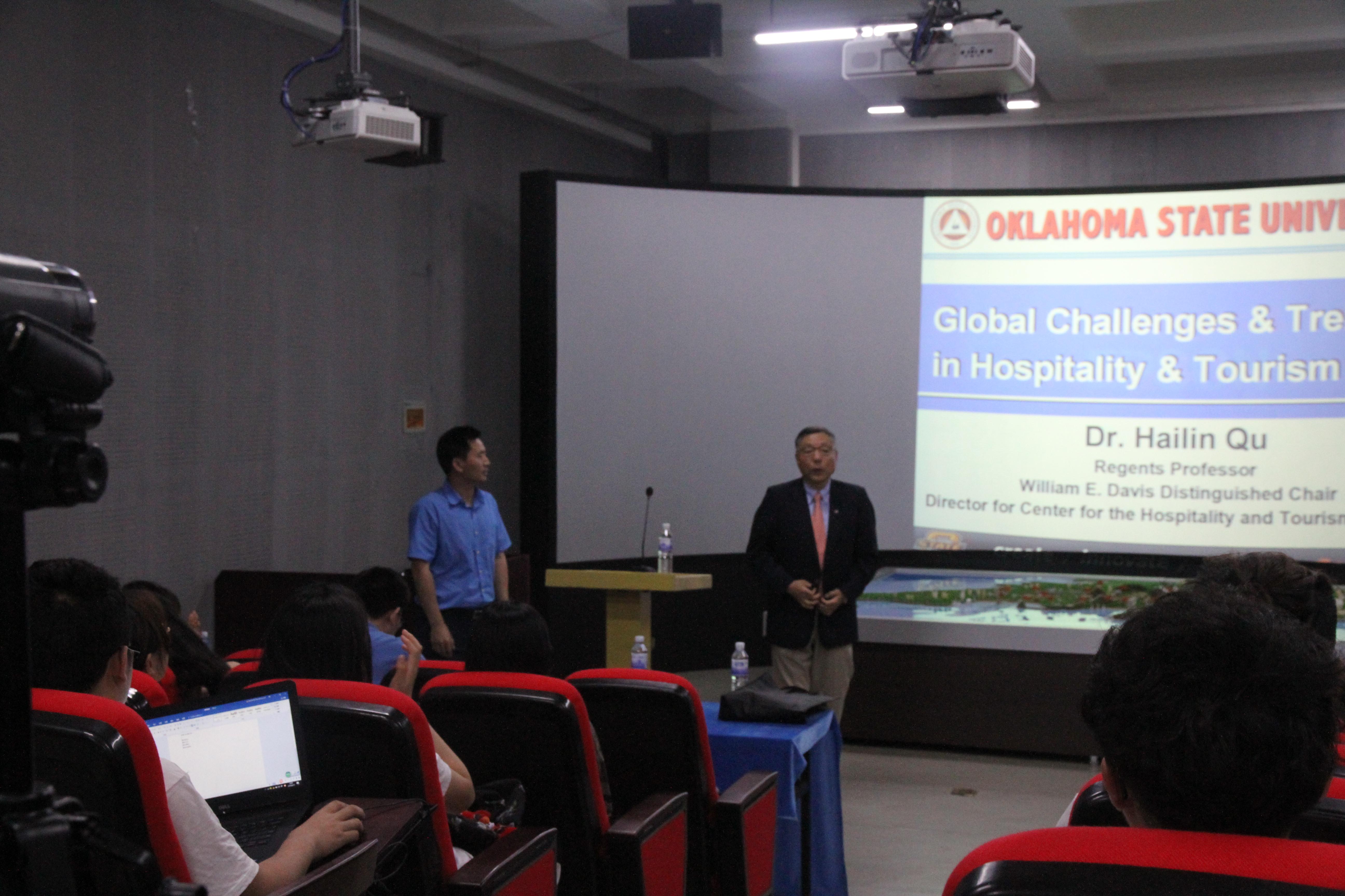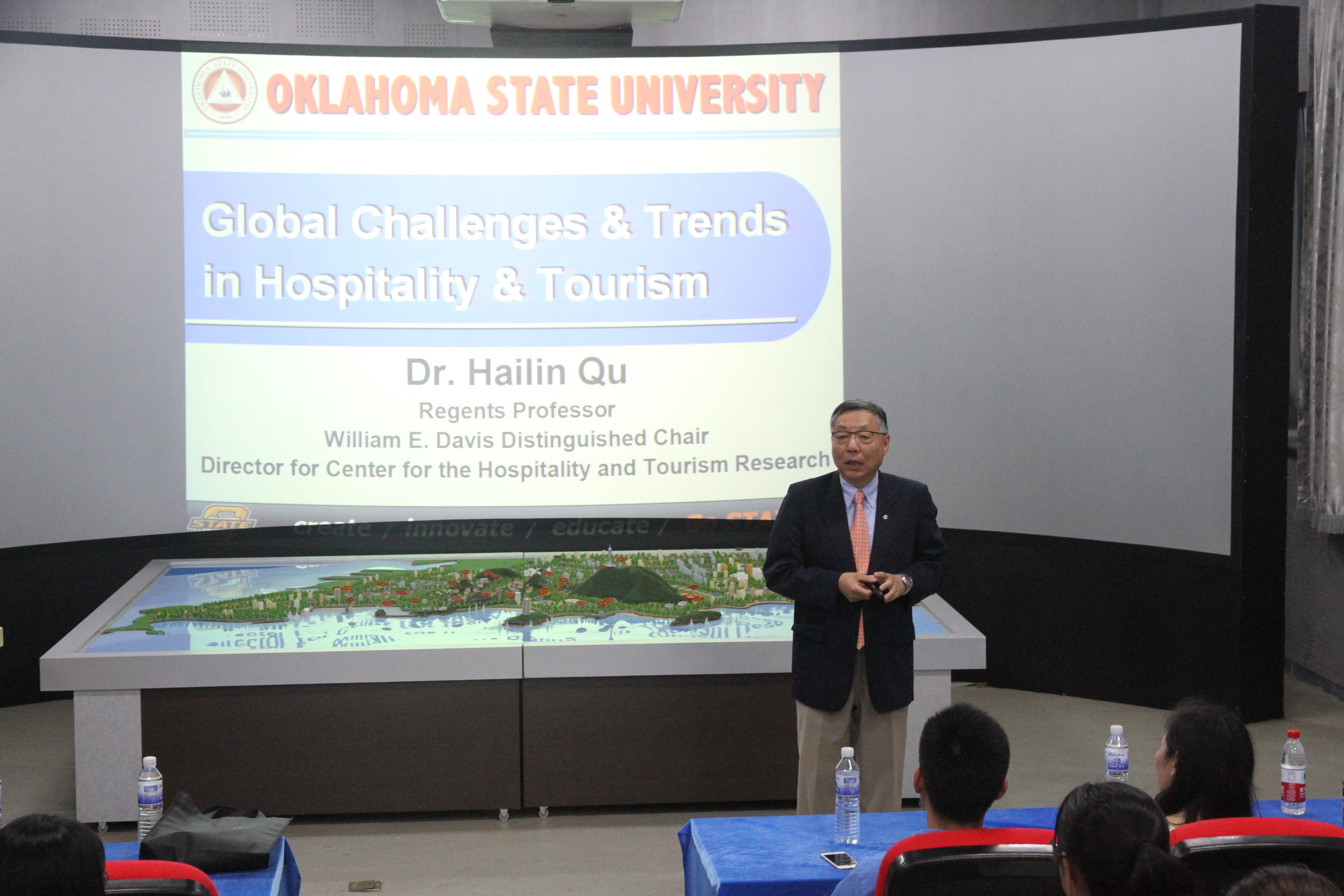 2018年6月13日下午两点,旅游与地理科学学院于taptap点点体育浮山校区静思楼2号旅游数字实验室举办“美国旅游酒店业发展趋势”学术报告会。本次学术报告特邀美国俄克拉荷马州立大学(Oklahoma State University)屈海林教授做学术交流报告,学院教师及学生代表参加了本次活动。