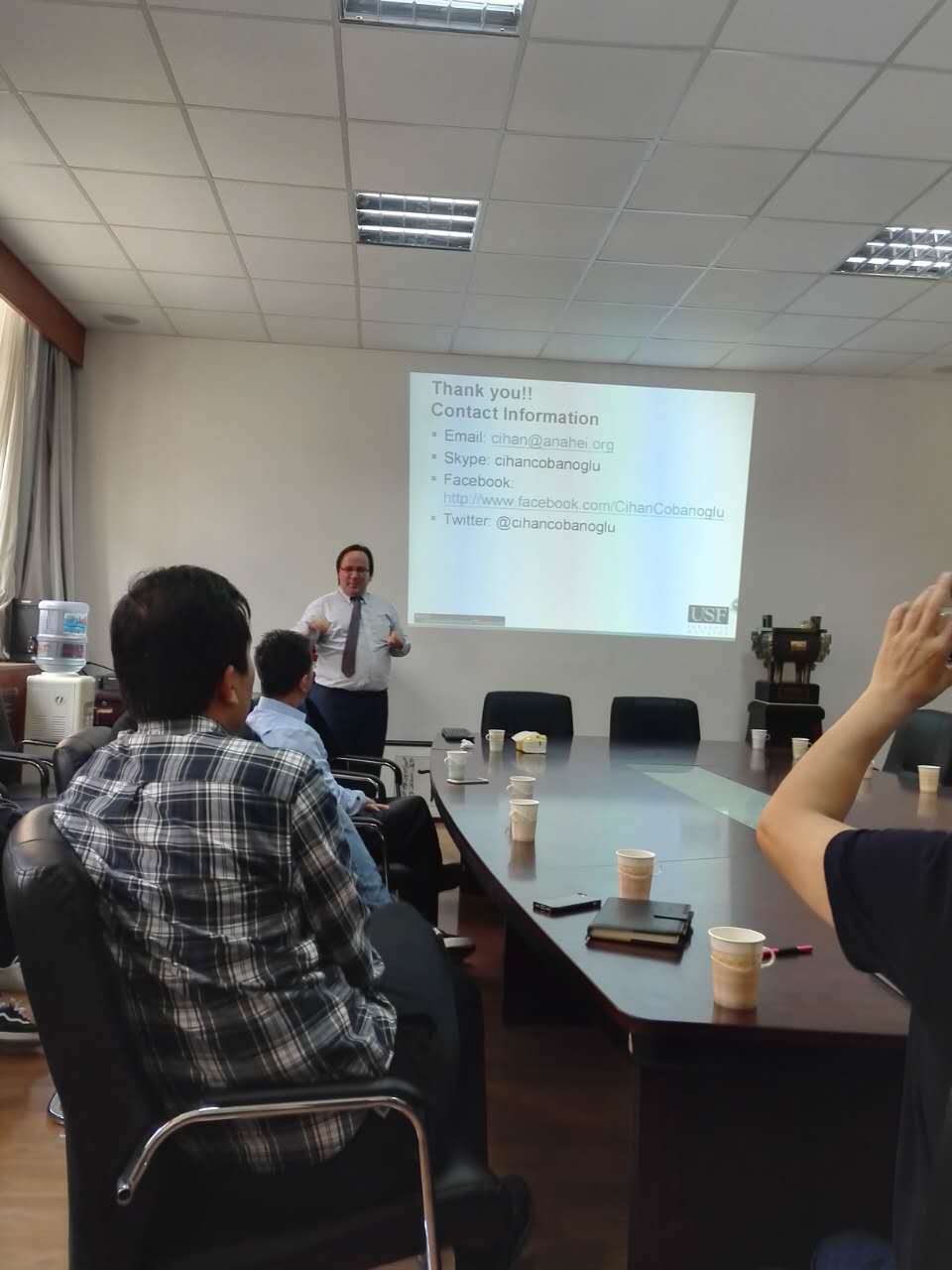 CihanCobanoglu教授有着丰富的教学、科研和实践经验,并担任JHTT、IIBA杂志的主编。报告会上CihanCobanoglu教授就美国高科技技术在酒店业的应用情况和未来的发展趋势方面做了生动的介绍。讲座后,CihanCobanoglu教授与参加讲座的师生就高新技术在美国酒店的普及情况、手机在酒店的全自助入住方面的应用等进行了交流。
