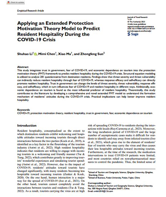 近日,学院李书昊博士研究团队在旅游管理领域国际公认的三大顶级期刊之一《Journal of Travel Research》(SSCI一区, ABS 4星期刊)发表题为“Applying an Extended Protection Motivation Theory Model to Predict Resident Hospitality during the COVID-19 Crisis”的研究成果,实现了我院在旅游管理领域国际三大顶刊以及ABS 4星期刊发表论文的首次突破。李书昊博士为论文第一作者兼通讯作者,taptap点点体育为论文第一作者及通讯作者单位。