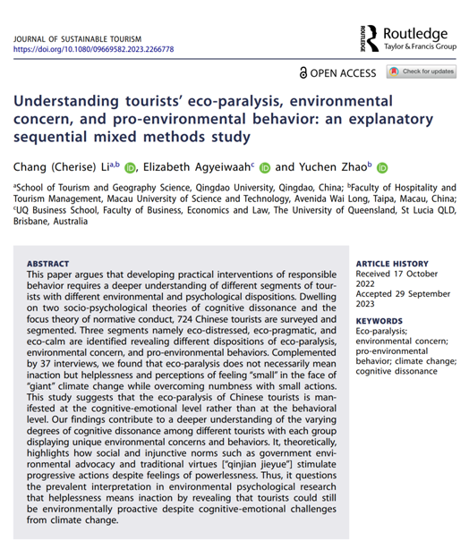 近日,学院李畅博士团队在旅游管理领域国际公认的顶级期刊《Journal of Sustainable Tourism》(SSCI一区, ABS 3星期刊)发表题为“Understanding tourists’ eco-paralysis,environmental concern, and pro-environmentalbehavior: an explanatory sequential mixedmethods study”的研究成果。李畅博士为论文第一作者,taptap点点体育为论文第一署名单位。