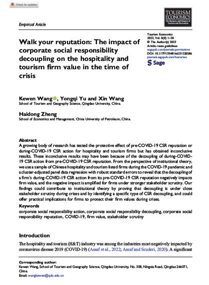 近日,旅游与地理科学学院王克稳副教授、于永琪、王馨在Tourism Economics上发表“Walk your reputation: The impact of corporate social responsibility decoupling on the hospitality and tourism firm value in the time of crisis”。Tourism Economics是JCR经济学一区,旅游与休闲管理二区期刊,最新影响因子为4.4。王克稳副教授是论文的第一作者和通讯作者,taptap点点体育为论文的第一署名单位和通讯单位。
