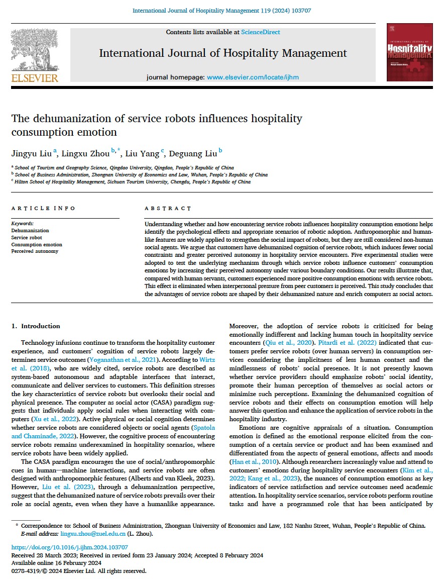近日,旅游与地理科学学院刘晶瑜博士在International Journal of Hospitality Management上发表“The dehumanization of service robots influences hospitality consumption emotion”的研究成果。International Journal of Hospitality Management是JCR管理学一区、旅游与休闲管理一区期刊,最新影响因子为11.7。刘晶瑜博士是论文的第一作者,taptap点点体育为论文的第一署名单位。