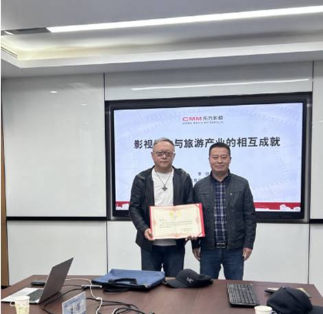 首先,肖建红院长为副董事长李锋颁发聘书,李锋被聘为我院旅游管理专业硕士研究生校外兼职导师。之后,李锋做题为“影视制作与旅游产业的相互成就”的学术报告,李锋结合自身工作经历,对影视制作全流程以及影视产业如何为旅游产业赋能进行了介绍。最后,李锋与参会师生进行了互动交流。
