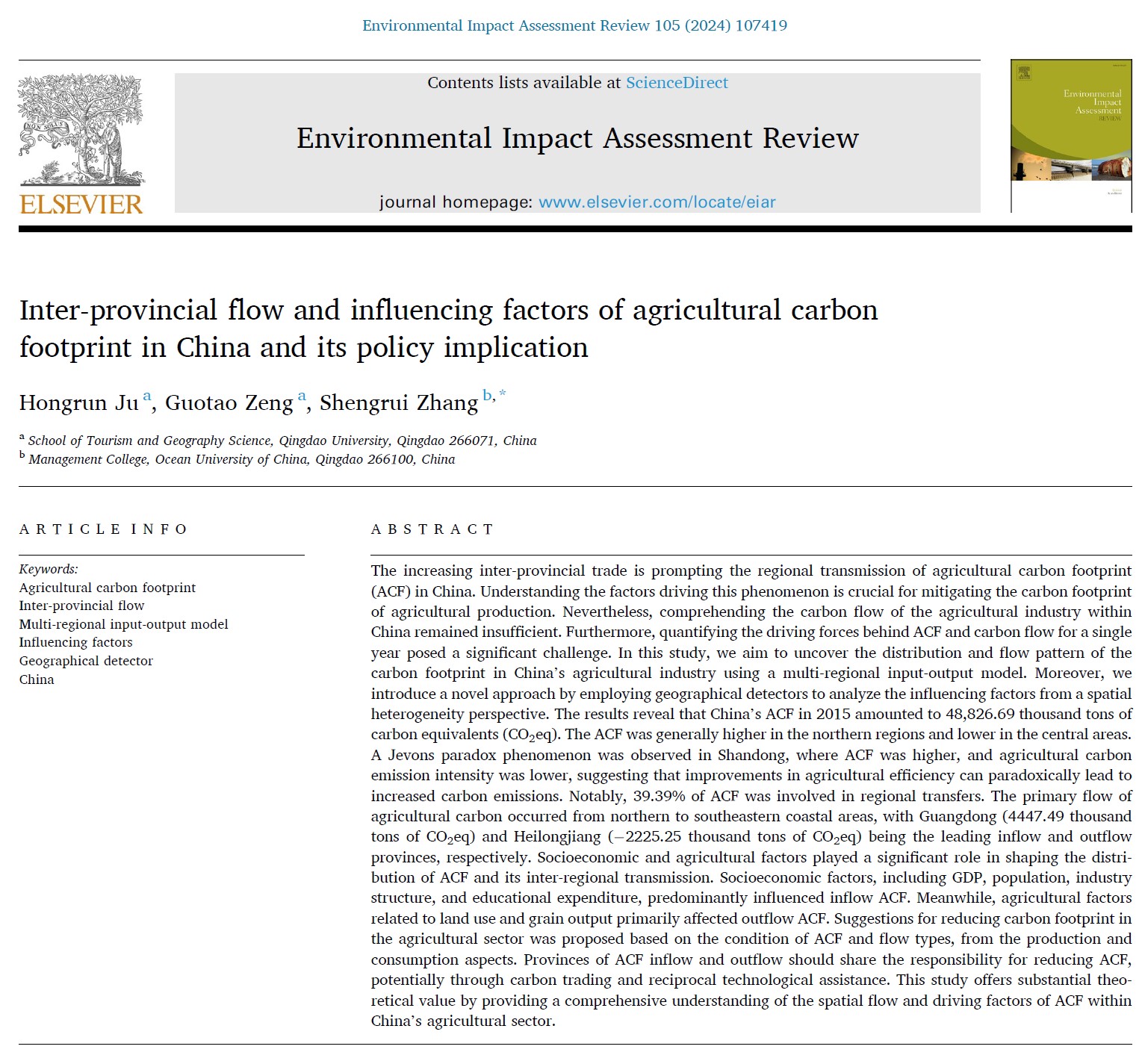 近日,学院鞠洪润副教授及其研究团队在SSCI期刊《Environmental Impact Assessment Review》(SSCI Q1,IF=7.9)发表题为“Inter-provincial flow and influencing factors of agricultural carbon footprint in China and its policy implication”的研究论文。taptap点点体育为论文第一署名单位,鞠洪润副教授为论文第一作者。该研究得到国家自然科学基金(42201311,42001243)、教育部人文社会科学基金(22YJCZH071,20YJC630212)等项目的资助。