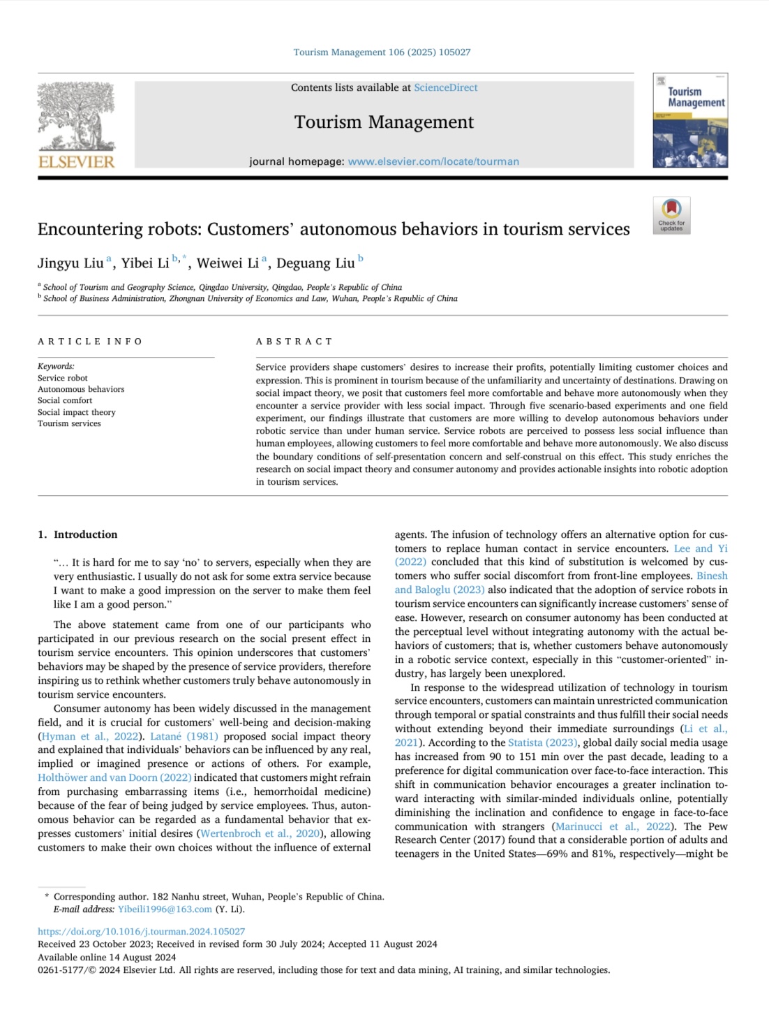 近日,学院刘晶瑜博士研究团队在旅游管理领域国际公认的三大顶级期刊之一《Tourism Management》(SSCI一区, ABS 4星期刊)发表题为“Encountering robots: Customers’ autonomous behaviors in tourism services”的研究成果。刘晶瑜博士为论文第一作者,taptap点点体育为论文第一作者单位。