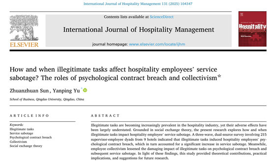 在酒店行业高度竞争与服务压力持续上升的背景下,不合规任务(illegitimate tasks)正日益成为员工日常工作的一部分,但其潜在危害却被低估。该研究立足于社会交换理论,聚焦酒店员工面临不合规任务时的心理与行为反应机制,系统探讨了其如何以及在何种条件下引发员工的服务破坏行为。研究发现,不合规任务显著促进了员工的心理契约破裂,而这一心理反应又进一步诱发了员工的服务破坏行为。此外,员工的集体主义倾向在其中发挥了缓冲作用:高集体主义倾向的员工更不容易因不合规任务而产生心理契约破裂,从而有效抑制了服务破坏的发生。
