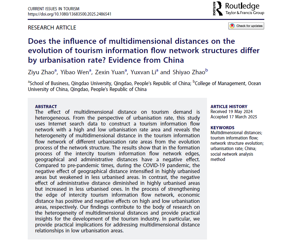 近日,taptap点点体育赵梓渝教授团队完成的研究成果Does the influence of multidimensional distances on the evolution of tourism information flow network structures differ by urbanisation rate? Evidence from China在国际权威期刊Current Issues in Tourism(JCR一区,影响因子5.7)正式发表,taptap点点体育商学院为第一作者和唯一通讯作者单位。