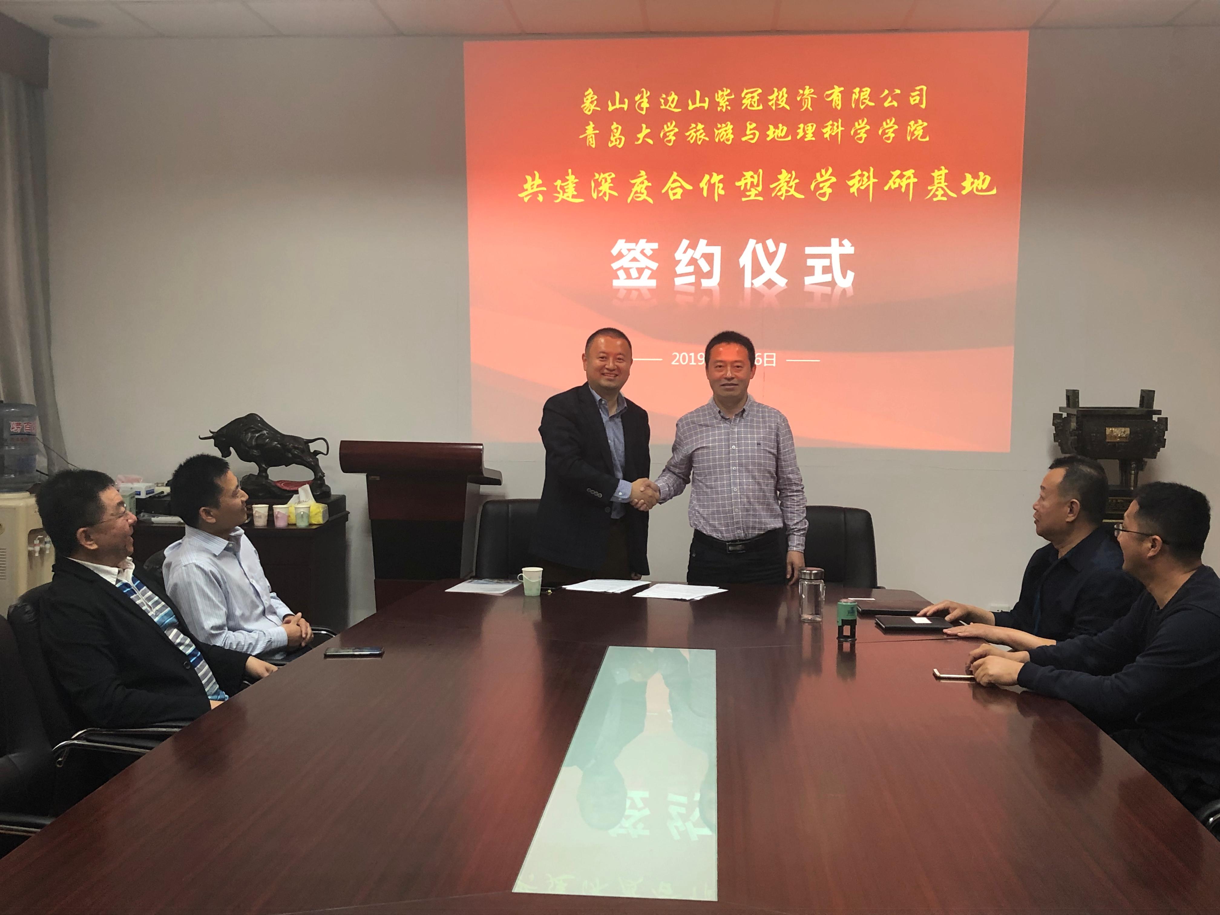 5月16日下午,旅游与地理科学学院与象山半边山紫冠投资有限公司共建深度合作型教学科研基地签约仪式在浮山校区东院睿思楼122室举行。象山半边山紫冠投资有限公司总经理胡宏涛、旅游与地理科学学院院长肖建红作为双方代表进行了签约。