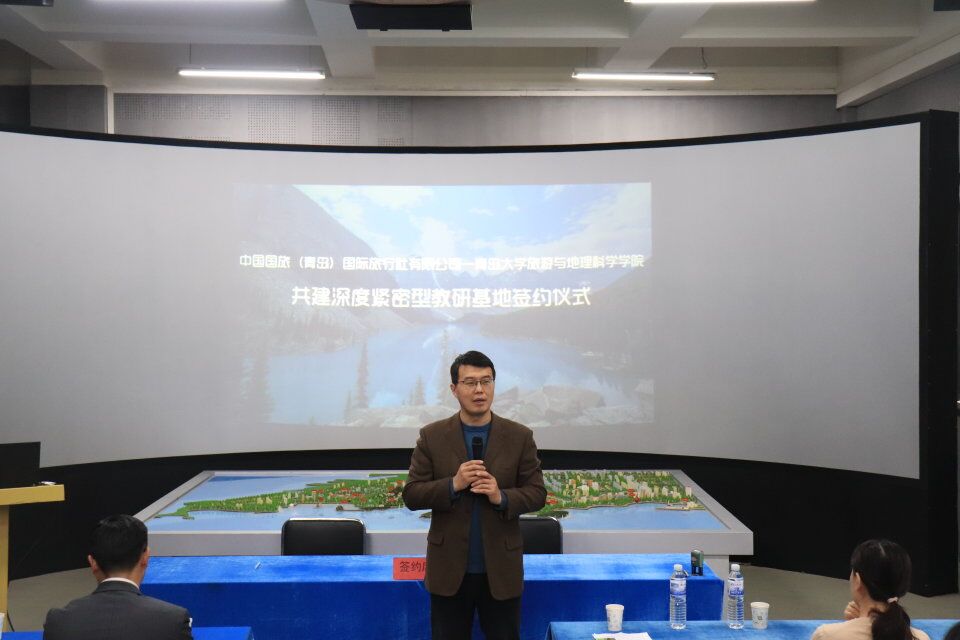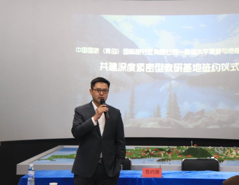 签约仪式由旅游与会展管理系主任赵玉宗主持。首先,副院长耿庆汇老师代表学院致辞,介绍了双方共建深度紧密型教研基地的背景与由来,展望了未来校企联合、产教融合,实现双方共赢的合作愿景。紧接着,中国国旅(青岛)旅行社有限公司出境旅游中心总经理赵青岭先生介绍了国旅背景、特色、规模以及发展计划,并对未来基地建设和合作给予期待。随后,耿庆汇老师和赵青岭先生分别代表双方签约。