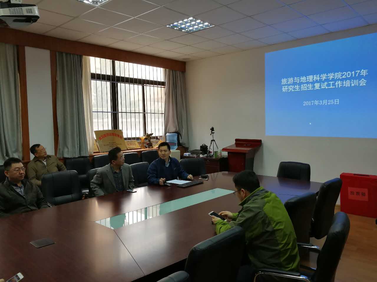 2017年3月25日,根据学校统一部署和要求,我院开展了2017年旅游管理学术硕士、旅游管理专业硕士(MTA)和学科教学(地理)共三个学科专业的研究生招生复试工作。为保证本次工作的顺利进行,学院专门成立了由院长、书记、学术委员会主席等组成的研究生招生复试工作小组,成立了三个学科专业复试小组,组织开展了2017年研究生招生复试工作培训会。在前期周密部署和认真准备的基础上,经过一天紧张而有序的工作,此次研究生招生复试工作圆满结束。